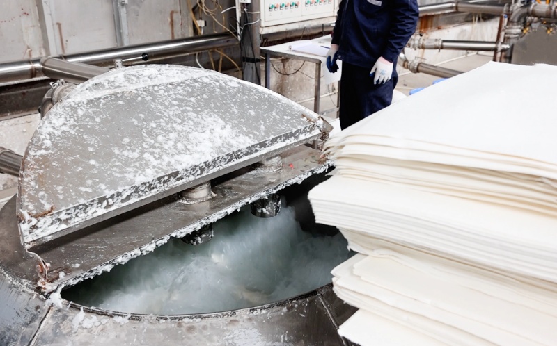 The dry pulp boards are placed into large hydra-pulpers filled with clean water. They are agitated to break the solid sheets back into a soft consistency. This rehydration process is crucial for preparing the natural fibers to be crafted into specific shapes for our disposable dinnerware lines.