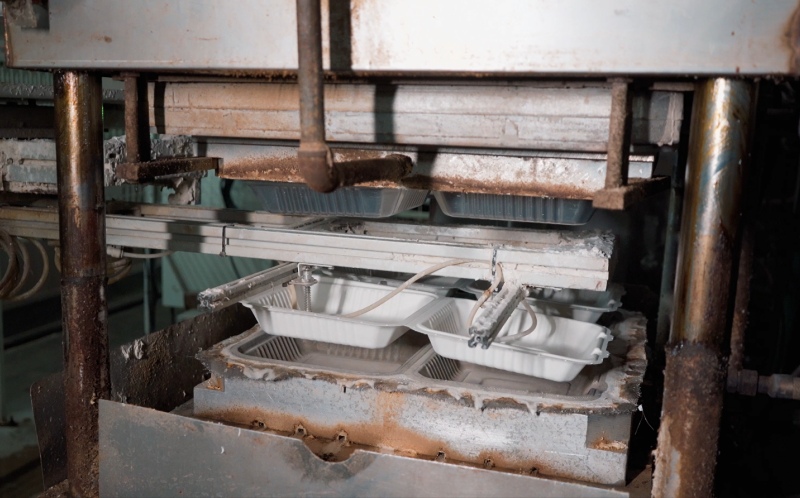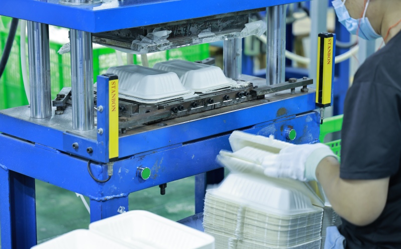 This is where the magic happens. The wet pulp is injected into precision molds. Using high heat and pressure, we thermoform the material into sturdy compostable plates and bowls. This process simultaneously sterilizes the product, locking in the strength of this plastic-free solution.