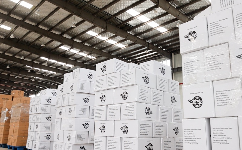 Once approved, products are sealed in dust-free packaging. We offer various solutions, from bulk cartons for wholesale bagasse tableware to retail-ready shrink wrap. The finished goods are palletized and stored in our warehouse, ready for global shipment to your distribution center.